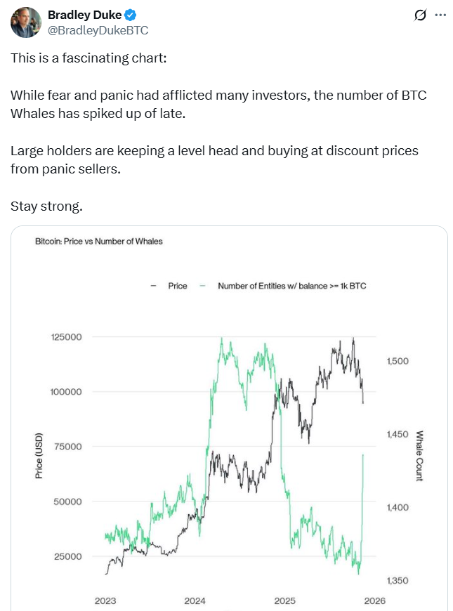 Bradley Duke, Managing Director and Head of Bitwise Asset Management in Europe, said in X post on Wednesday that his company has noticed that as fear and panic grip the market, whales have been buying the dip.