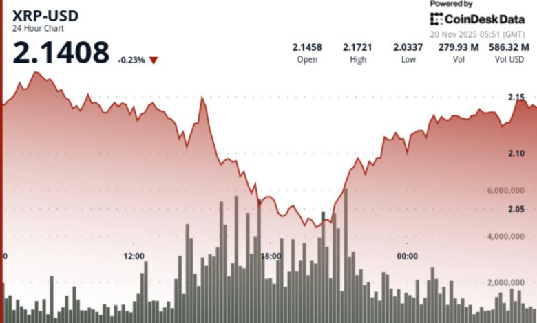 XRP endured another technical breakdown Tuesday, sliding 3.6% to $2.13 as institutional selling intensified below the key $2.15 support level. The decline unfolded across a volatile $0.17 range, with volume spiking 76% above 24-hour norms to 177.9M tokens — confirming large-order participation during the structural failure.