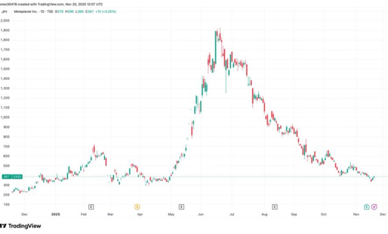 The preferred equity comes at a time when Metaplanet’s common shares have fallen more than 80% from their all time high and now trade at 387 yen.