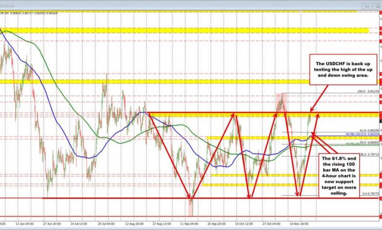 The USDCHF has traded higher this week. Yesterday, the run higher took the price above a key cluster of technical levels including the 200 bar moving average on the 4 hour chart (Green line on the chart below), the 50% midpoint of the most recent trend moved to the downside (at 0.8000 level), and the 100 bar moving average on the 4 hour chart (blue line on the chart below). That open the door for further momentum and the price moved up to a swing area target between 0.8066 and 0.8076.