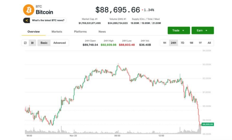 Falls to $88K, Erases Bounce After Nvidia Earnings