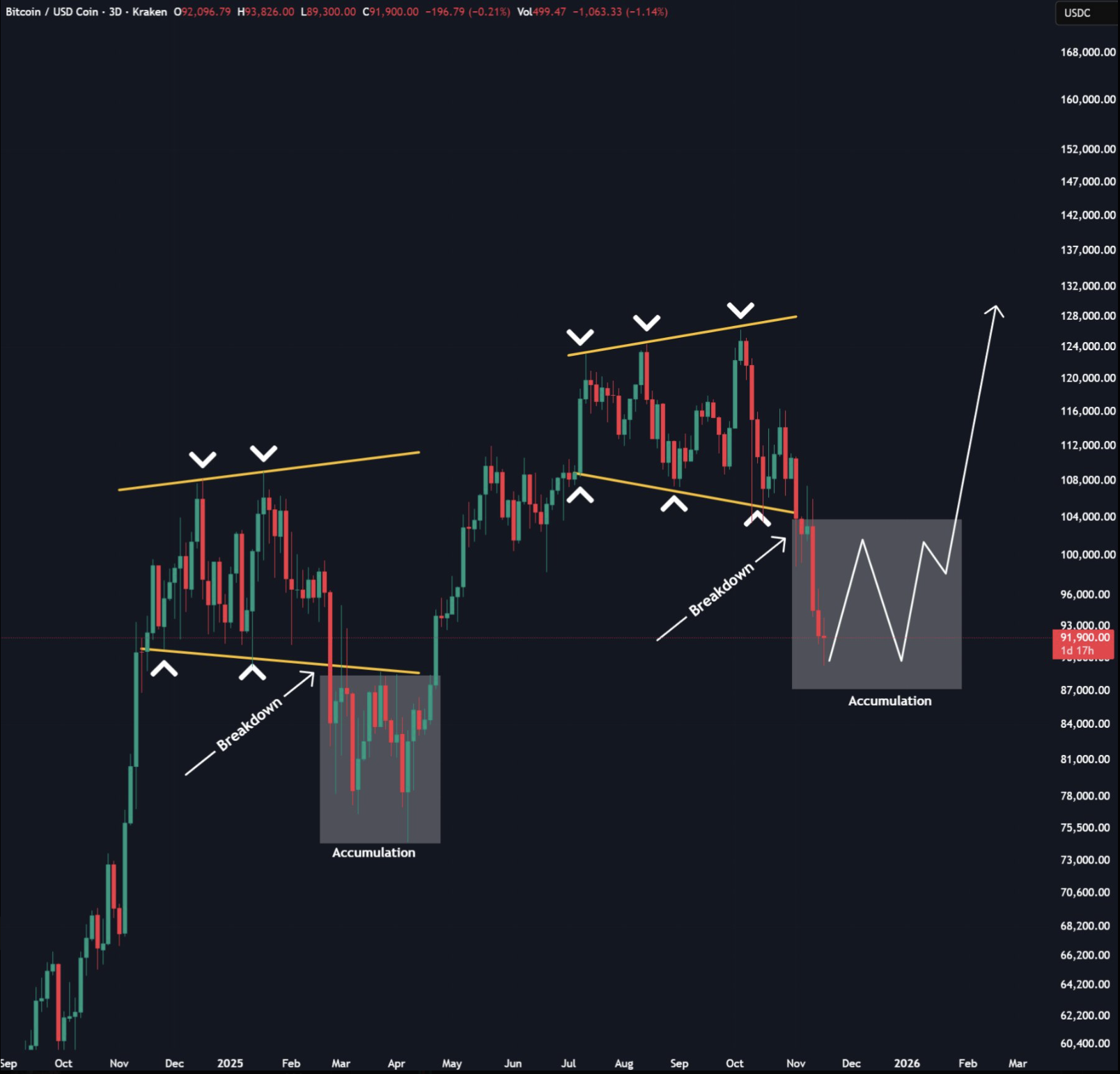 Back then, BTC lost momentum near its fresh all-time high, slipped below a key support level, and decoupled from a rising stock market before bottoming out in a multi-week accumulation range.