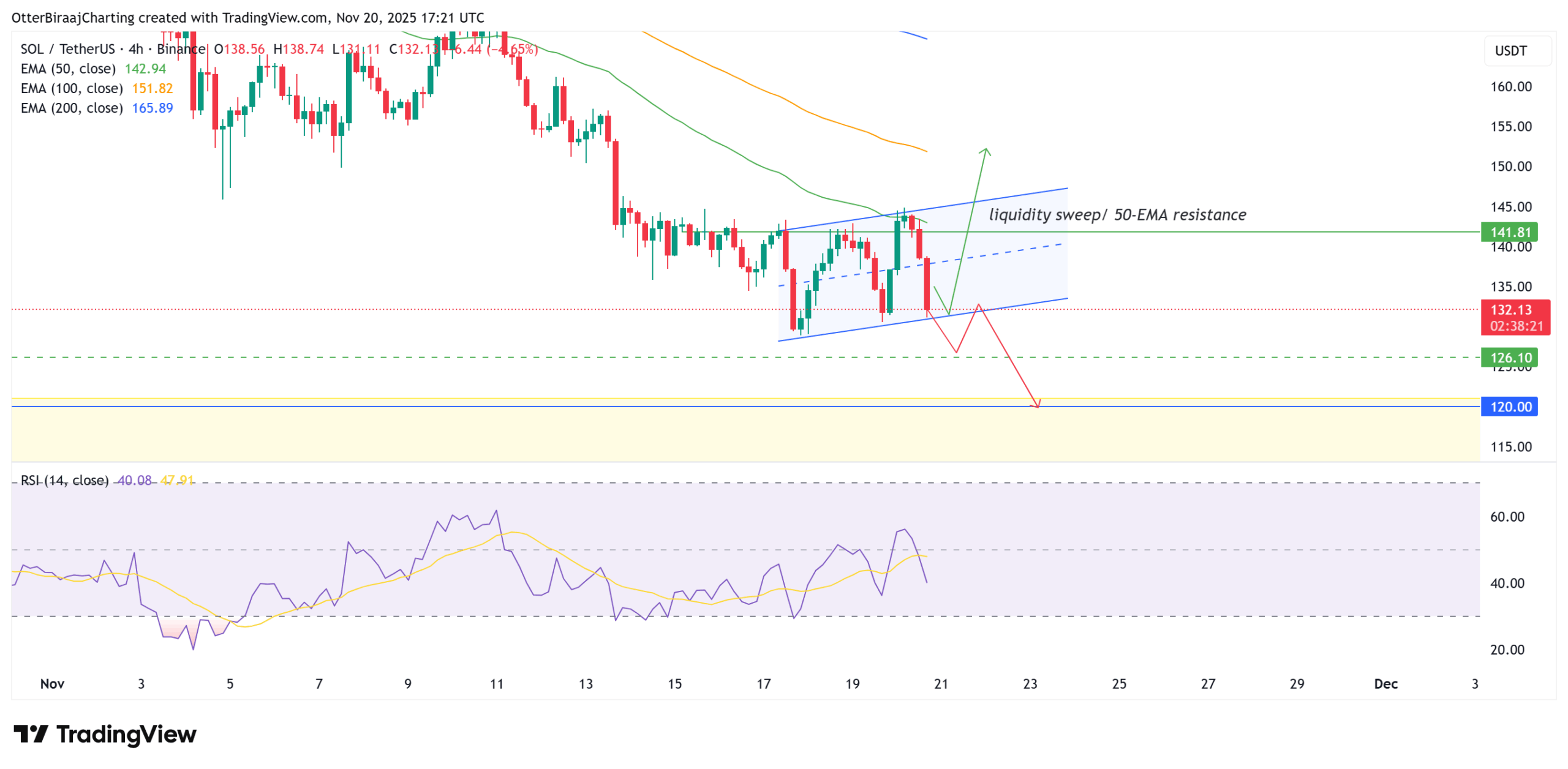 Solana briefly outperformed Bitcoin, Ether, and XRP on Nov. 20, printing a higher-high and higher-low structure on the one-hour and four-hour charts. But its rally was quickly capped by heavy resistance at the 50-EMA, which rejected the price back toward $132.