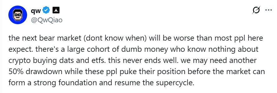Industry voices say the downturn may only be the start. Alliance DAO co-founder QwQiao reposted his warning in September, arguing that the next bear market may be harsher than expected.