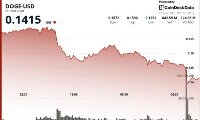 • DOGE collapses 11.2% from $0.1578 → $0.1401, breaking multiple support layers