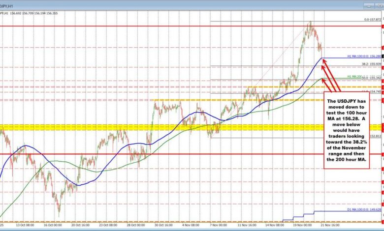 The USDJPY has experienced weakness in the last hour, extending its decline to the 100-hour moving average at 156.28, with a low print of 156.22 just beneath it.