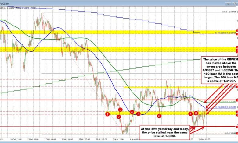 GBPUSD technicals. Buyers making a break above swing level and tests 100 hour MA