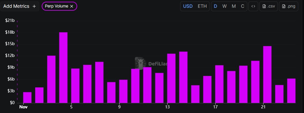 Despite a broader crypto market slump, perpetual DEXs saw consistent daily volumes ranging from $28 billion to $60 billion, according to DefiLlama.