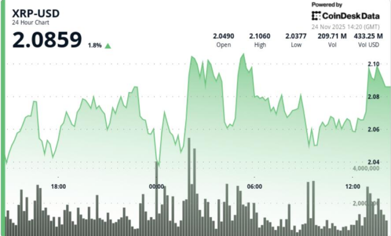 XRP declined steadily through Tuesday’s session, slipping from $2.13 to $2.08 as profit-taking and weak spot flows overshadowed the bullish ETF news cycle. The token traded within a volatile range of $2.03 to $2.15, reflecting persistent uncertainty across crypto markets.