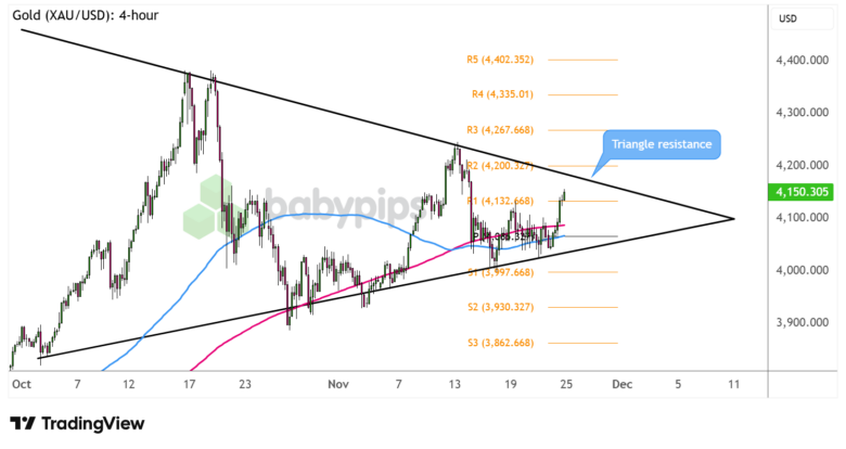 Gold has just climbed past R1 ($4,132.66) on its way to test the symmetrical triangle resistance close to R2 ($4,200.32) and a major psychological mark.