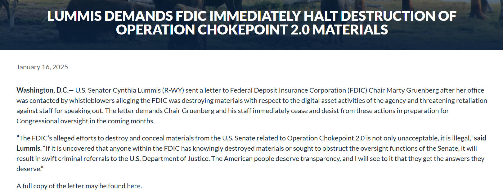“The FDIC’s alleged efforts to destroy and conceal materials from the U.S. Senate related to Operation Chokepoint 2.0 is not only unacceptable, it is illegal,” said Lummis in a letter published on Jan. 16, threatening “swift criminal referrals” if the wrongdoing was uncovered.