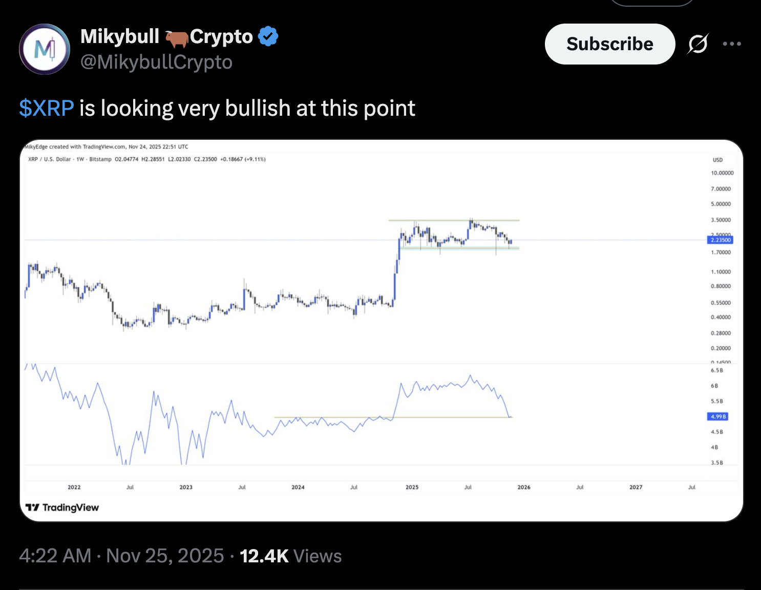 However, these EMAs sit almost exactly at the upper trendline of XRP’s descending channel, in a pattern that has guided the price lower since the summer.