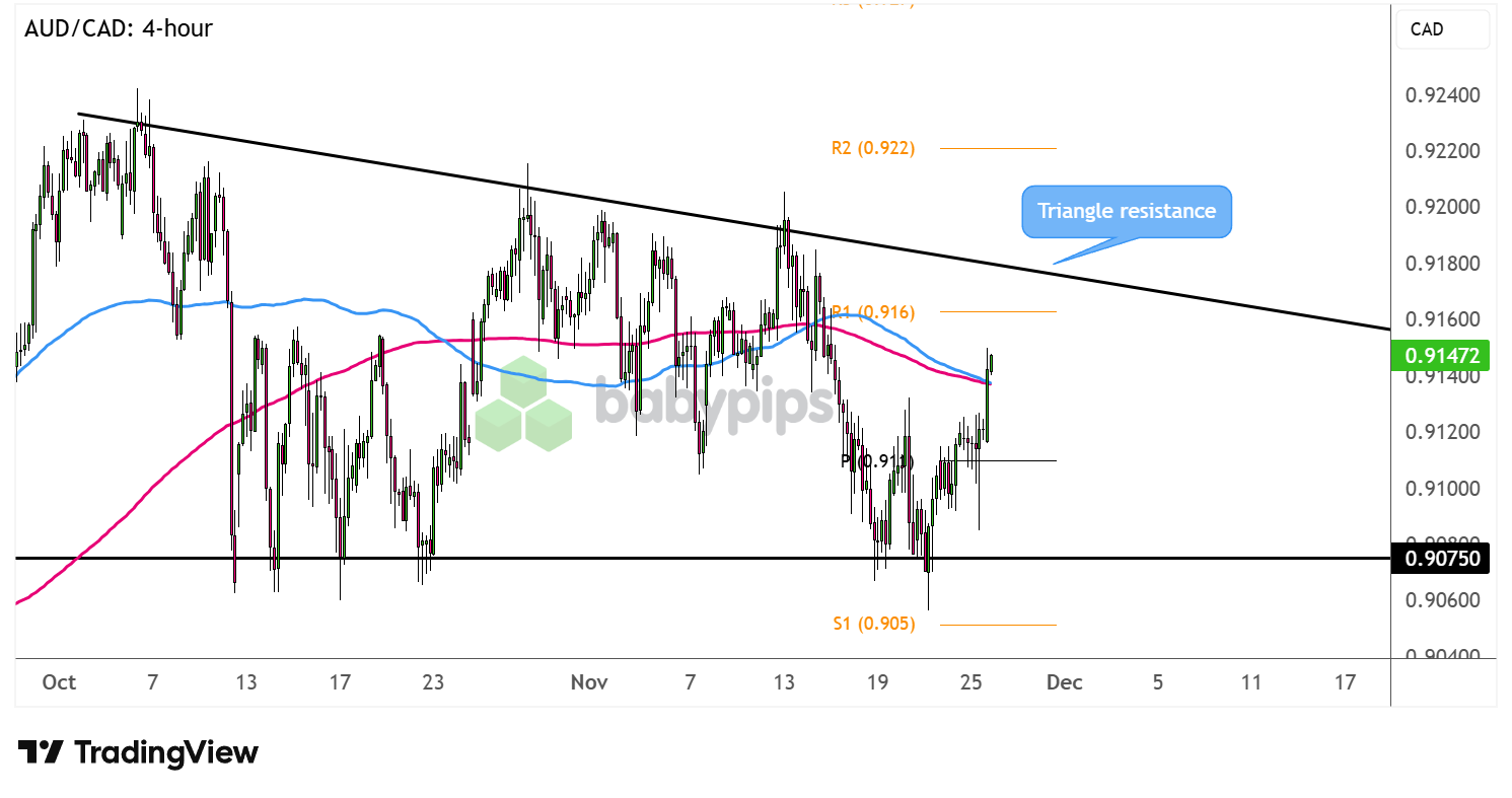 AUD/CAD has formed lower highs and found support around the .9075 level, creating a descending triangle on its 4-hour time frame.