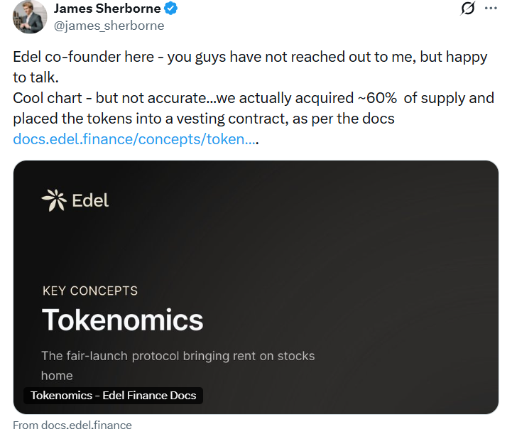 Responding to the findings, James Sherborne, the co-founder of Edel Finance, said that the team planned to acquire 60% of the token supply, which was subsequently locked into token vesting contracts.