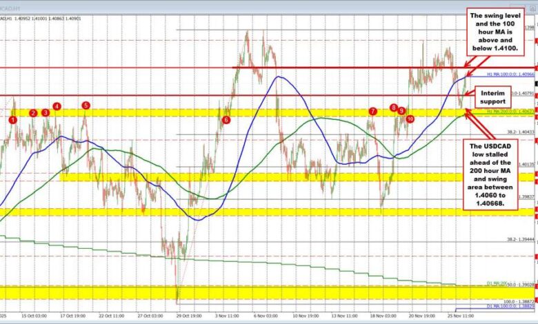 The USDCAD fell yesterday after stalling at its rising 100-hour moving average, and an early-Asia bounce today failed beneath the 1.4105 swing area. That inability to extend higher invited sellers back in, pushing the pair below the 100-hour moving average and through the 1.4079 swing level. Momentum accelerated into a key support zone between 1.4060 and 1.40668, which also houses the rising 200-hour moving average at 1.40623. The low held just above that at 1.40665, and a rebound briefly reclaimed the 100-hour moving average before failing once again.