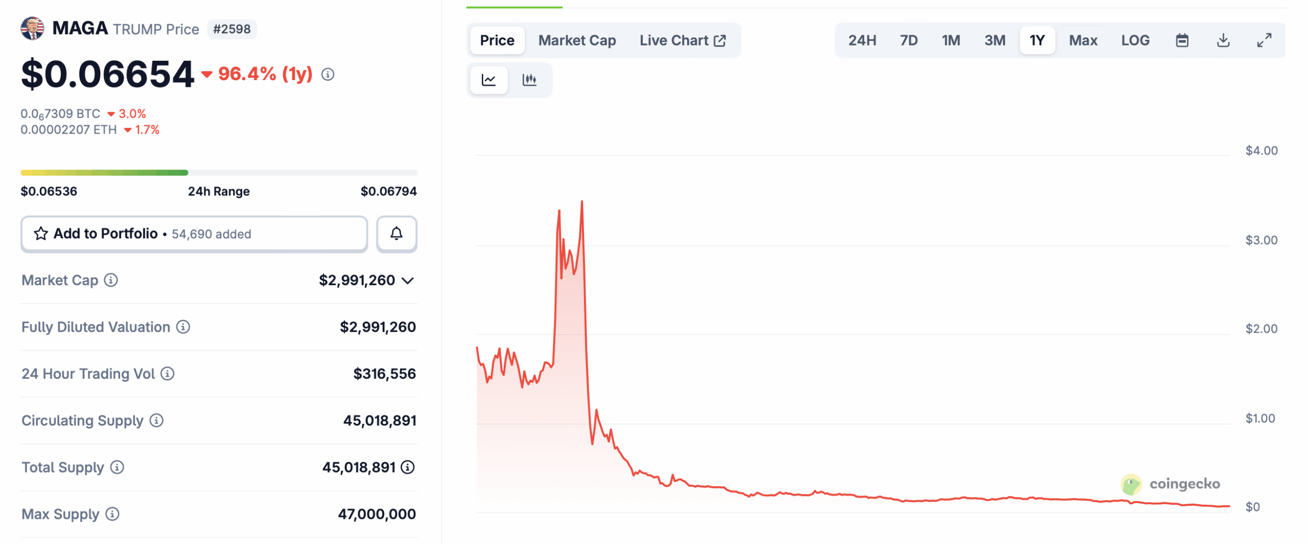Politically themed memecoins have fared worse. Official Trump (TRUMP), a token that uses US President Donald Trump’s name without any confirmed affiliation, is down about 99.6% from its launch peak.