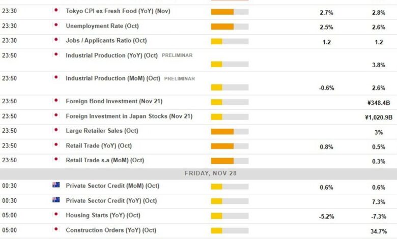 Economic calendar in Asia Friday, Nov 28, 2025: Japan inflation indicator (Tokyo CPI). BoJ meet on December 18 and 19. Developments in inflation data will be keenly eyed. The policy board is still tossing up a rate hike at that meeting, or not.