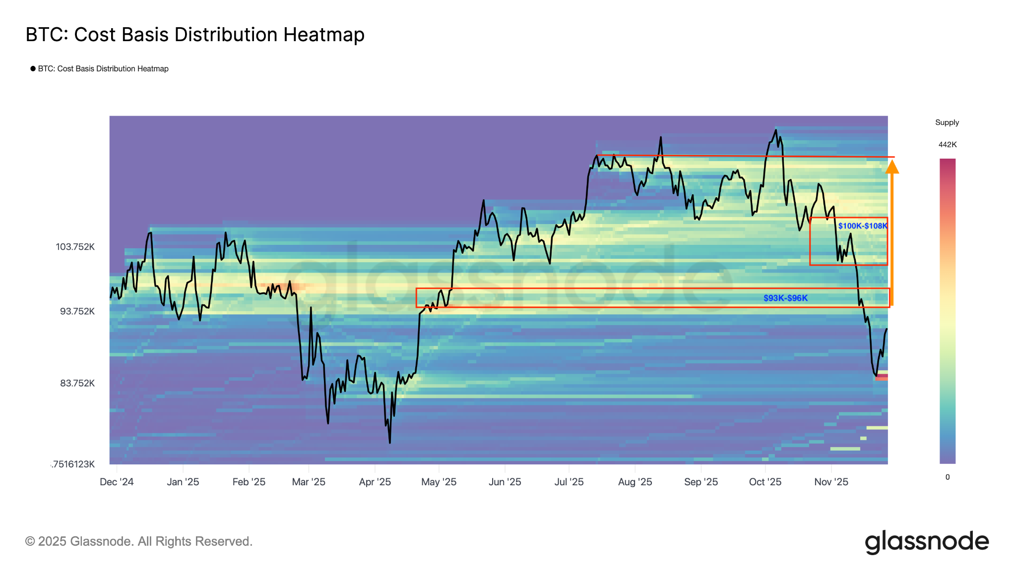 Glassode’s cost basis distribution heatmap reveals resistance at $93,000-$96,000, where investors acquired about 500,000 BTC.