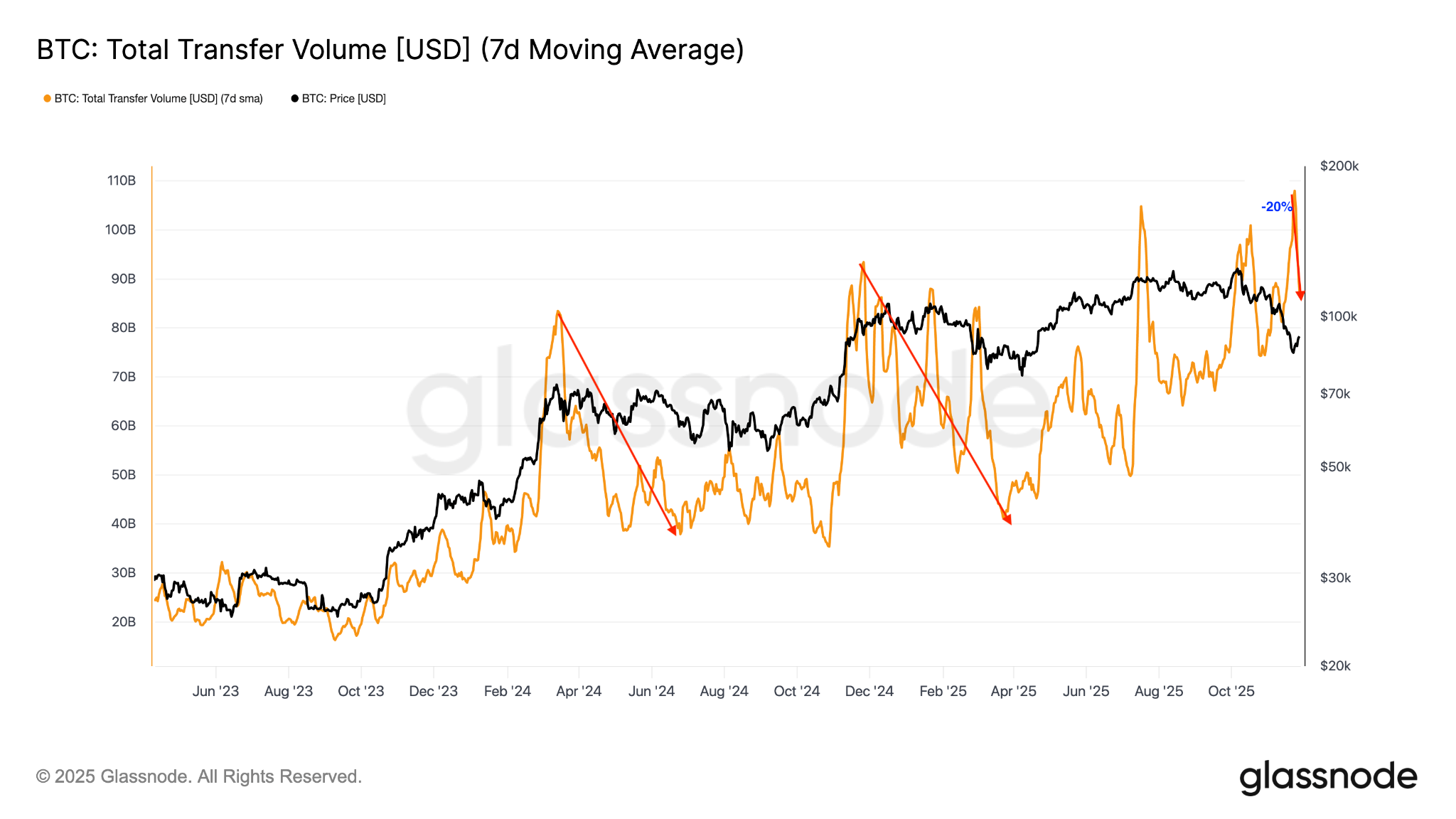 Bitcoin’s onchain transfer volume falls 20%