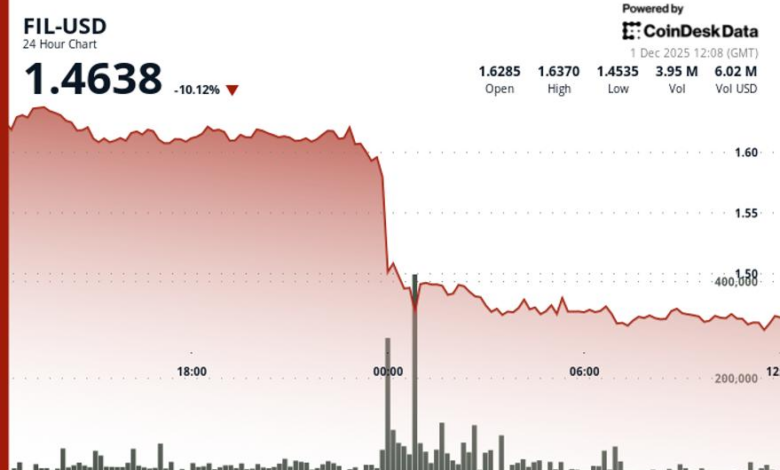 Filecoin dropped more than 10% to $1.46 during in the past 24 hours, underperforming the broader cryptocurrency market, which was itself heading south.