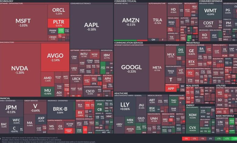 Today’s US stock market heatmap reveals significant sector disparities, with the Technology sector seeing substantial weaknesses, while Healthcare demonstrates resilience. Key tech players like Microsoft (MSFT) and Palantir (PLTR) are down by 1.03% and 2.53% respectively, indicating bearish sentiment within software infrastructure.