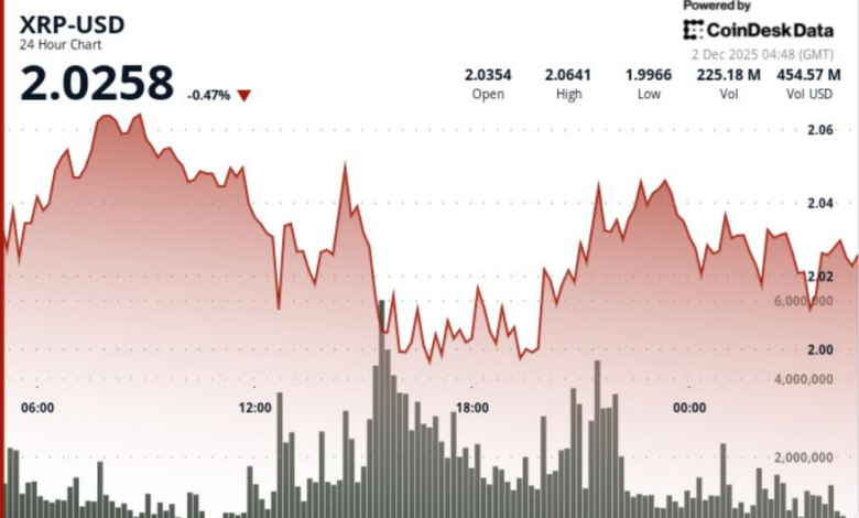 • XRP briefly slipped under $2.00 as Monday’s crypto session saw broader risk-off positioning