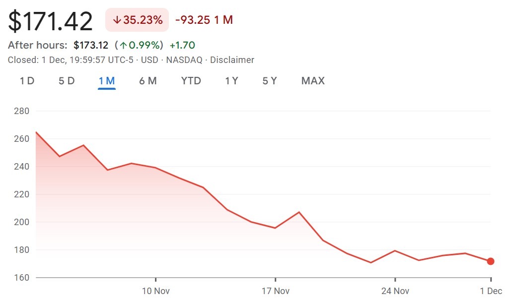 Google Finance data showed that Strategy, the sector’s biggest DAT, fell 35.23% over the month, dropping from $264.67 on Nov. 3 to $171.42 at the time of writing.