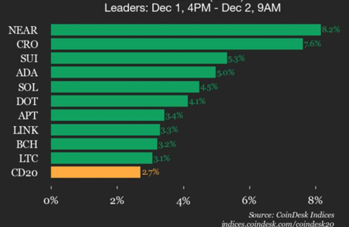 Leaders: NEAR (+8.2%) and CRO (+7.6%).