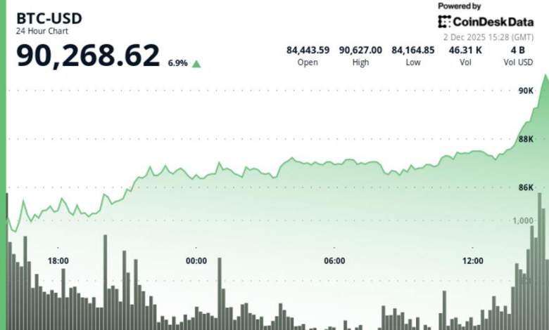Bitcoin surged back above $90,000 during Tuesday’s U.S. morning hours, erasing most of its steep plunge from Sunday to Monday to below $84,000. The largest cryptocurrency was up 8% over the past 24 hours, helping lifting the broader digital asset markets.
