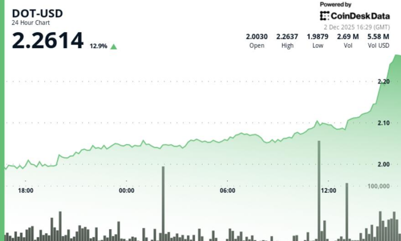 The broader market index, the CoinDesk 20 index, rose 9% in the same time period. DOT’s outperformance suggests asset-specific drivers dominated price action.