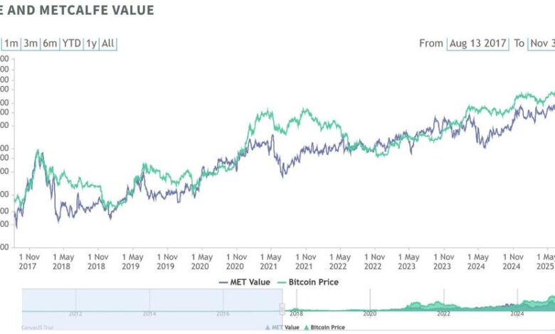 Metcalfe value estimates the fundamental worth of a network using activity and user-based growth, and has historically offered useful context during major cycle turns.