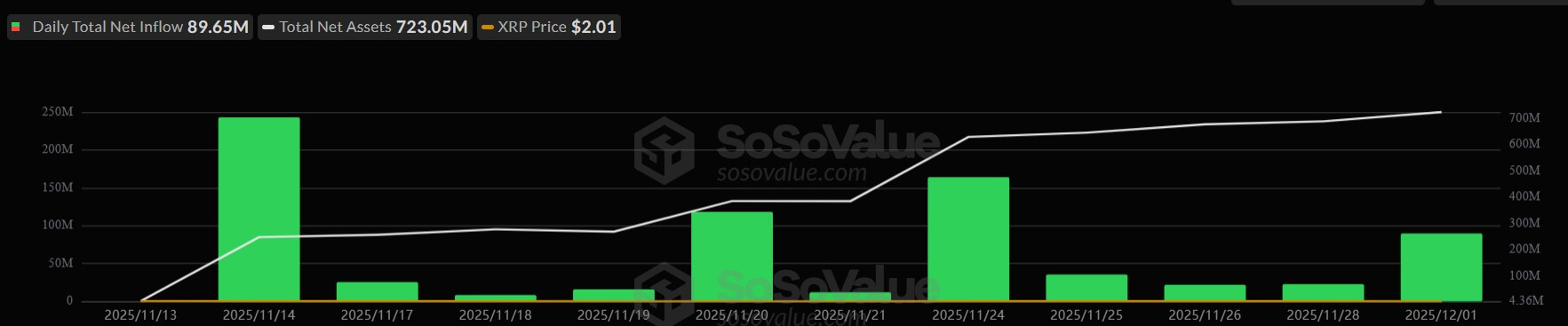 XRP spot ETFs have posted one of the most consistent inflow streaks of this quarter, attracting roughly $756 million across eleven consecutive trading sessions since their Nov. 13 launch.