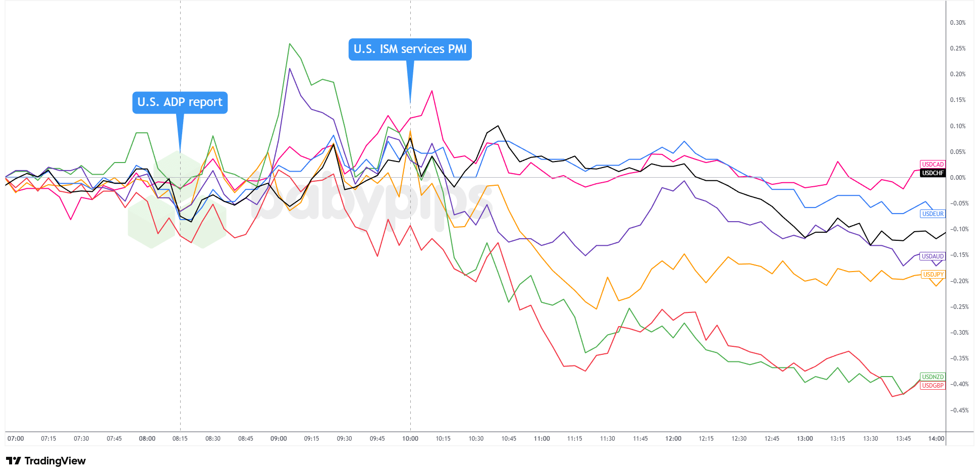 When ADP confirmed the 32,000-job decline—far worse than the expected 15,000 gain—the dollar extended its losses but also saw immediate bullish pullback, potentially on profit-taking aroudn the U.S. session open and ahead of the ISM services PMI release.