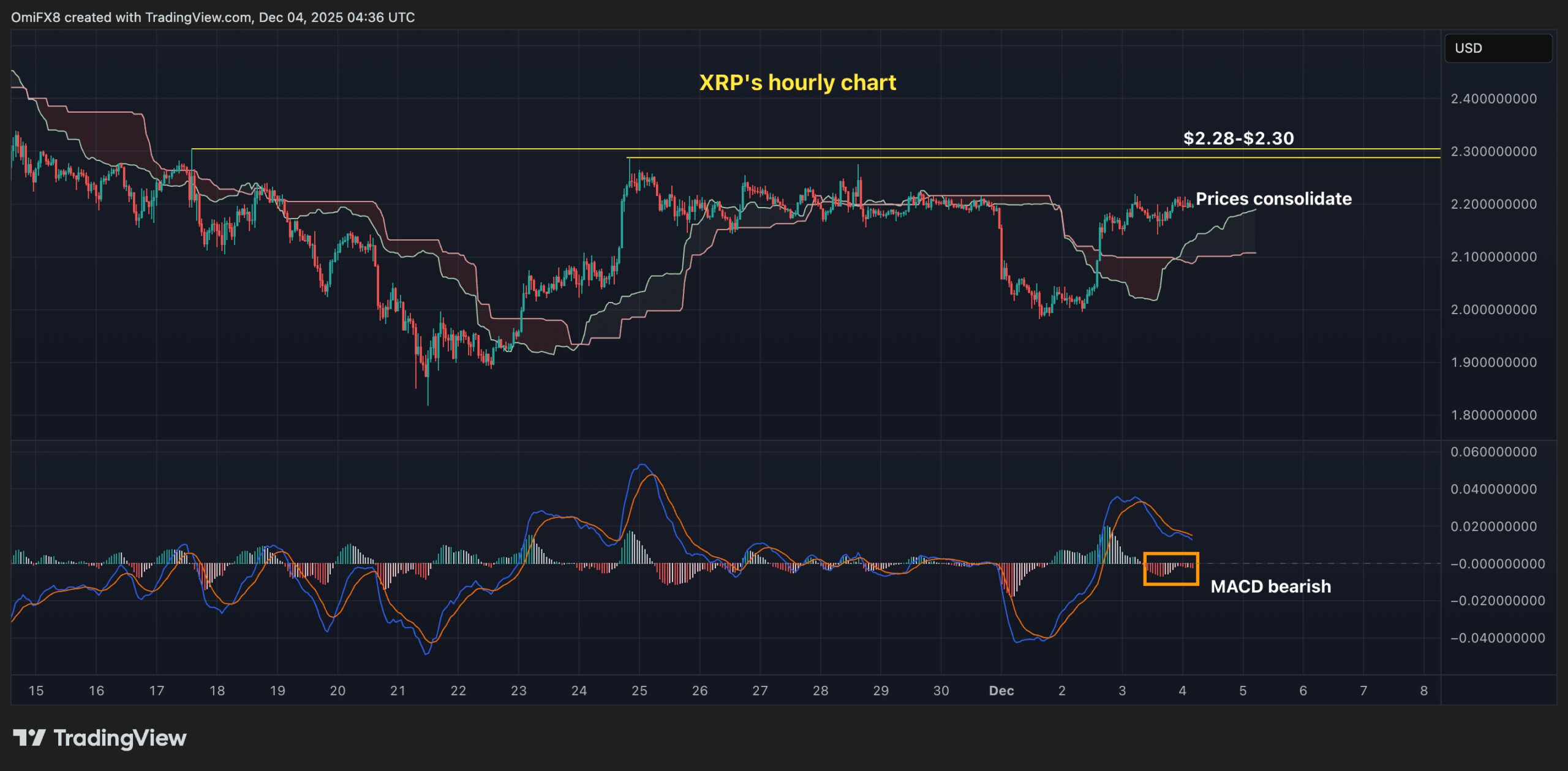XRP seems to be building a base near $2.20 for the subsequent upside leg after decisively crossing into bullish territory above the Ichimoku cloud earlier this week. The prevailing sideways consolidation coincides with a bearish crossover in the hourly MACD histogram; however, the absence of concomitant price erosion underscores latent underlying strength and supports the case for sustained upward momentum.