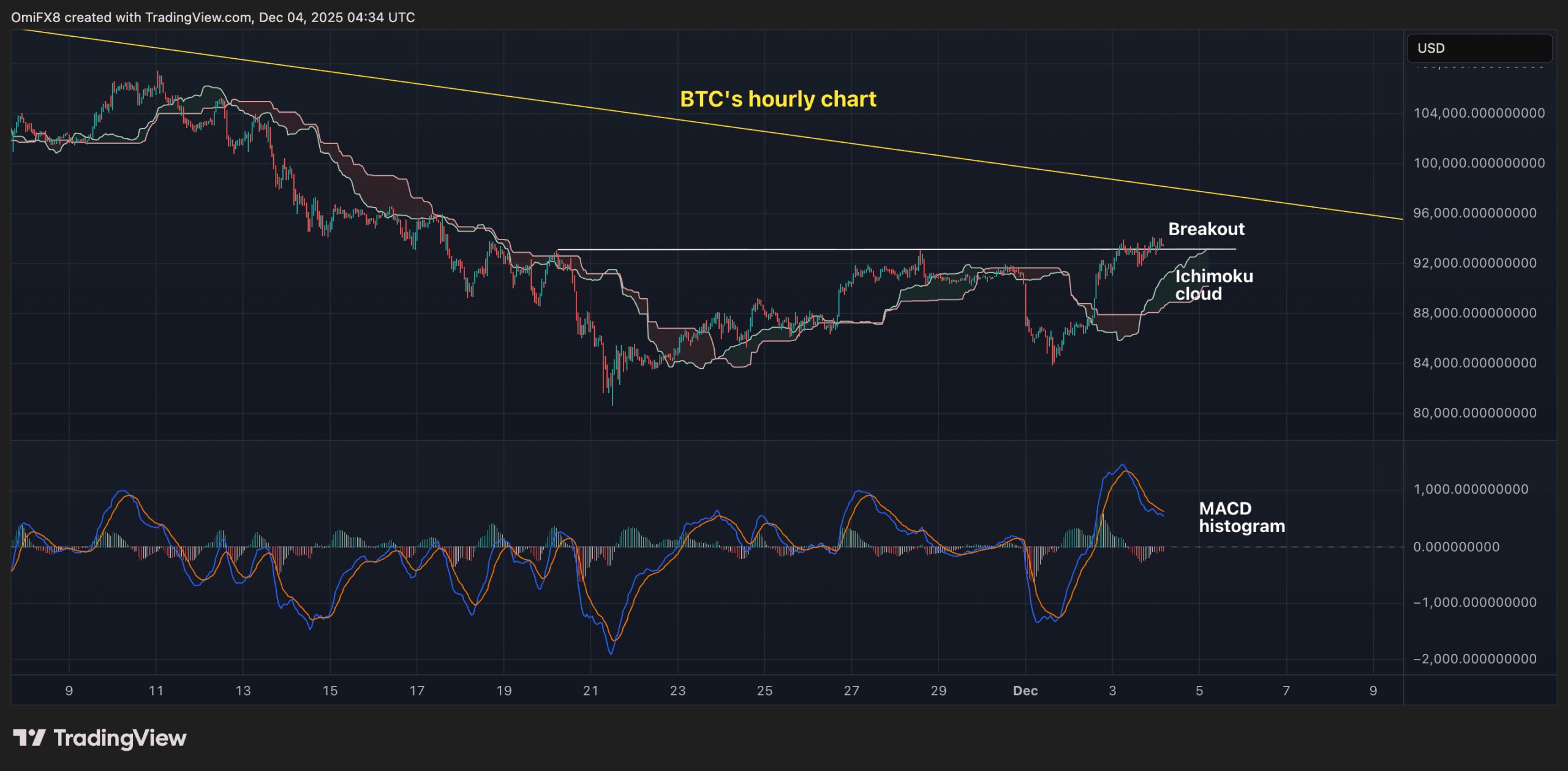 BTC’s hourly chart in candlestick format. (TradingView)
