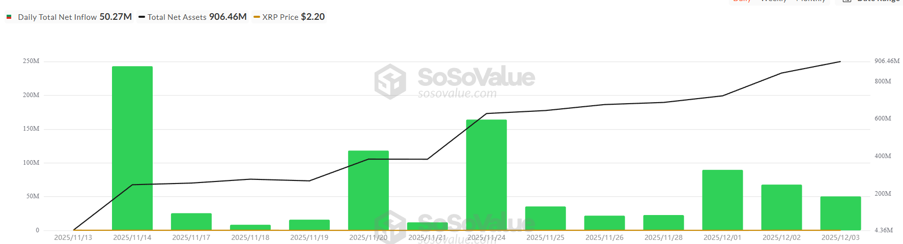 The spot XRP (XRP) ETF continues to lead altcoin ETF debuts this year, with $243 million in first-day inflows, according to SosoValue.