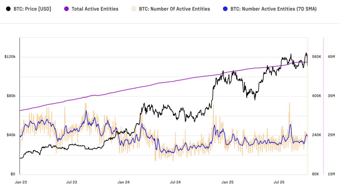 Glassnode pointed out that one of the most informative measures of Bitcoin adoption, the Active Entities metric, shows a structural decline in on-chain participation since ETF approval.