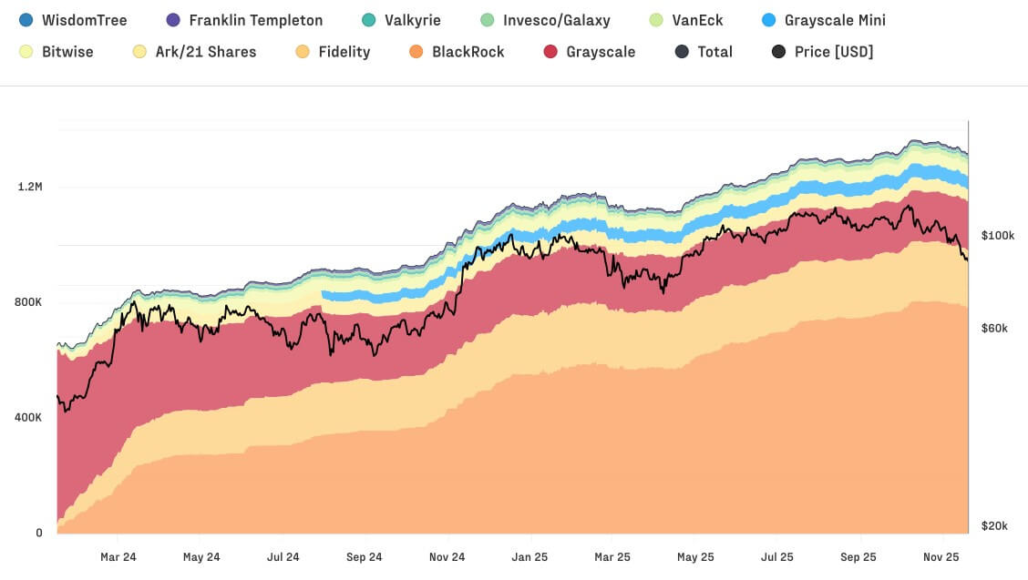 Notably, the assets under management of these products tell a similar story. US-listed Bitcoin ETFs now hold approximately 1.36 million BTC, totaling roughly $168 billion.