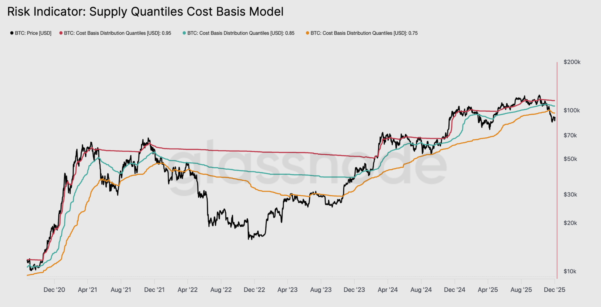 The resemblance is corroborated by a Supply Quantiles Cost Basis model, which tracks the entry price of the largest coin clusters. Since mid-November, Bitcoin’s price has fallen below the 0.75 quantile, now trading near $96,100, placing more than 25% of supply underwater.