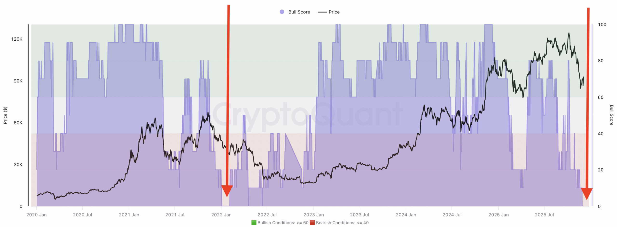 CryptoQuant’s Bull Score Index offers a more granular view after falling sharply since August and dropping below 40 in October. The metric has remained flat throughout November despite short-term price volatility.
