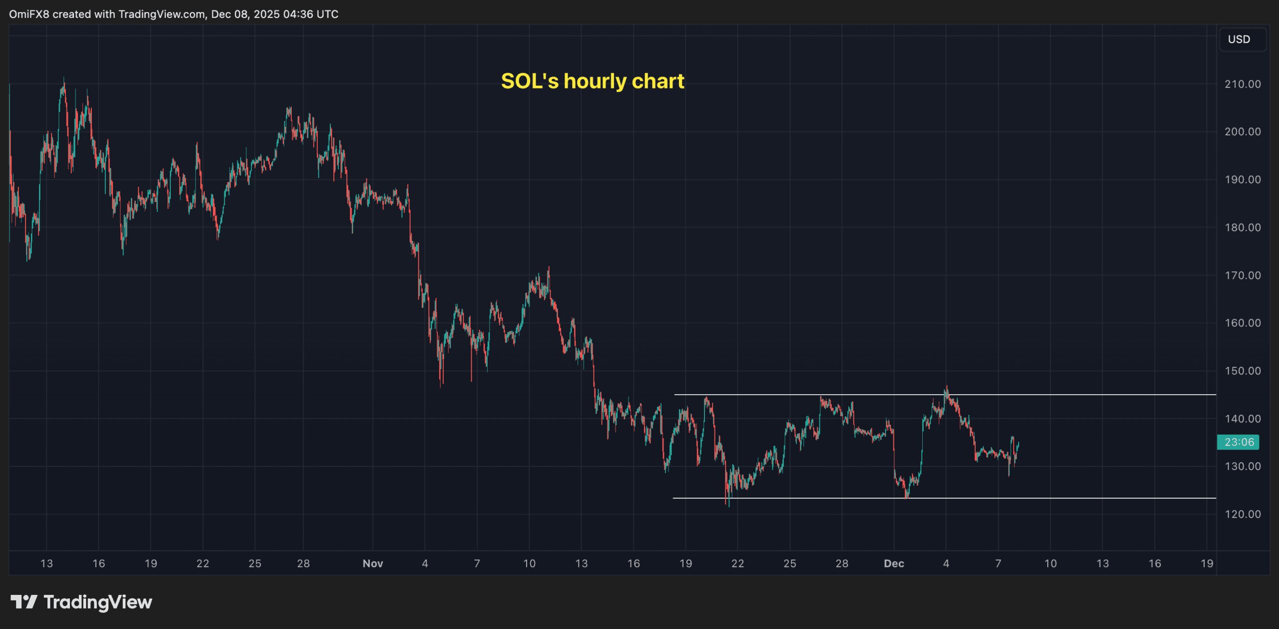 Solana continues exhibiting range-bound indecision, trading within a sideways channel defined by $145 upper resistance and $120 lower support, with current levels near $134.