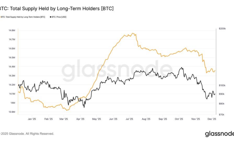 Since the summer, long-term holders have reduced their holdings from 14,769,512 BTC in July to 14,330,128 BTC in November.