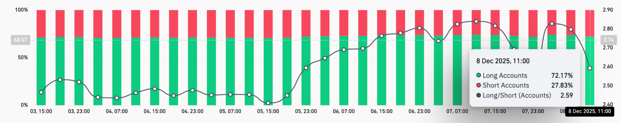 XRP’s ratio of long/short accounts on Binance is currently skewed toward bullish positions at 72%. While this heightened activity introduces liquidation risks, it underscores rising confidence in XRP’s upside.