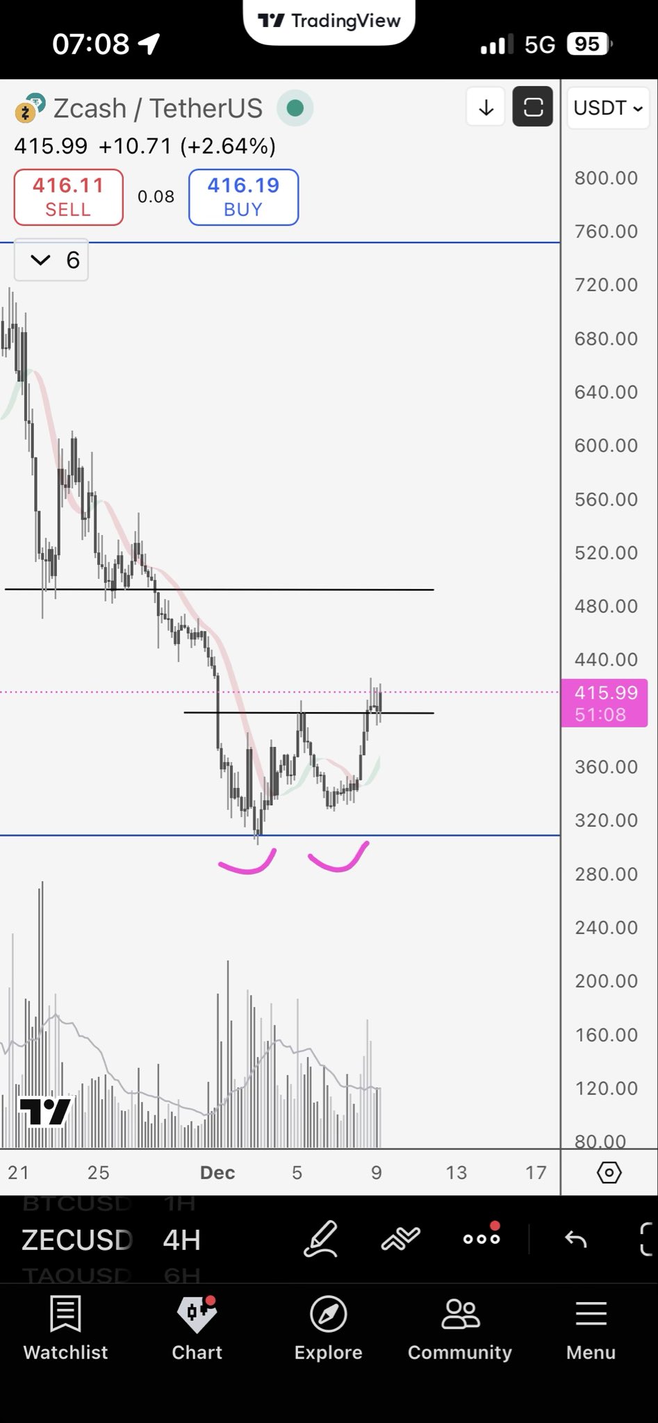 The pattern appeared to develop in the $300–$310 region, where ZEC recorded two similar troughs within a short time frame. The subsequent move above the interim resistance near $380 marked what the trader described as a neckline breakout.
