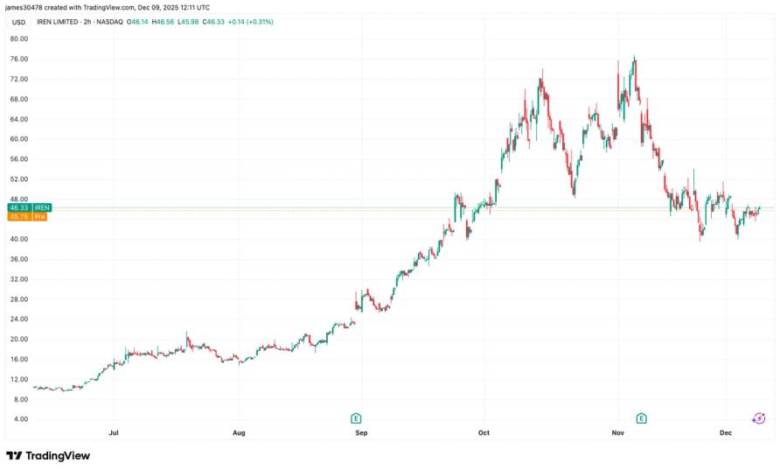 IREN fell 1% in pre-market trading to $45 per share, some 40% below its November all-time high.