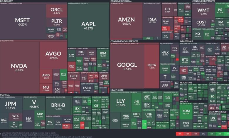 - Technology: Despite being a historically strong sector, technology remains under pressure. Microsoft (MSFT) experienced a -0.20% decrease, and semiconductor leader Nvidia (NVDA) saw a decline of -0.67%. The prevailing mood suggests a cautious approach as investors digest recent tech earnings and anticipate potential interest rate changes.