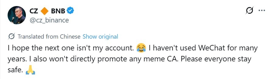 However, Zhao warned that he would not promote any memecoin contract addresses on this account, giving users a quick reminder to stay safe amid growing threats.