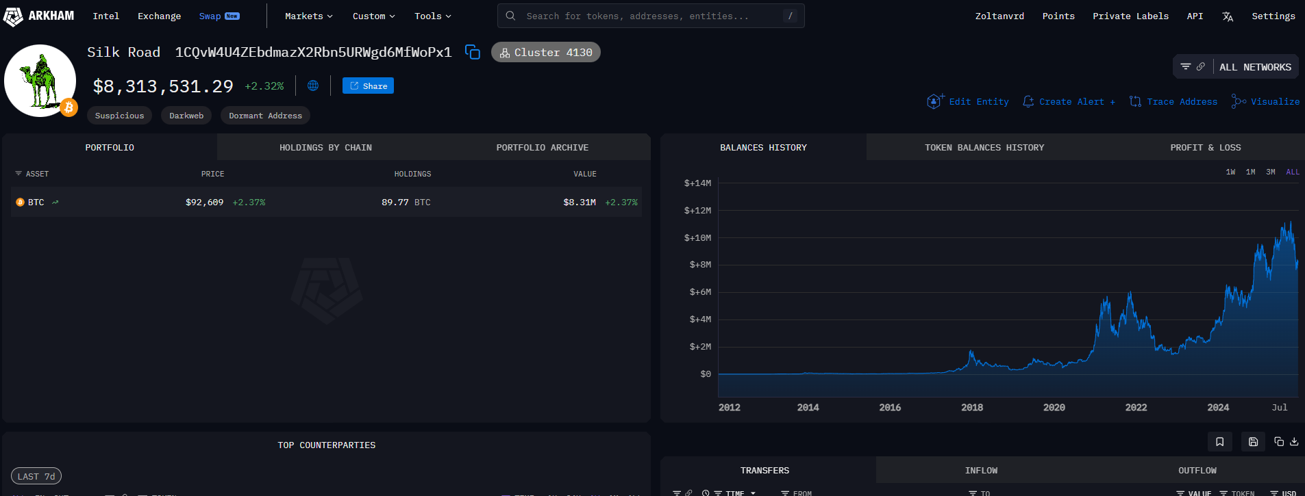 Another Silk Road-tagged wallet likely belonging to Ulbricht holds $8.3 million in Bitcoin. Barring three small test transactions in the past 10 months, the wallet has been inactive for 14 years, according to Arkham.