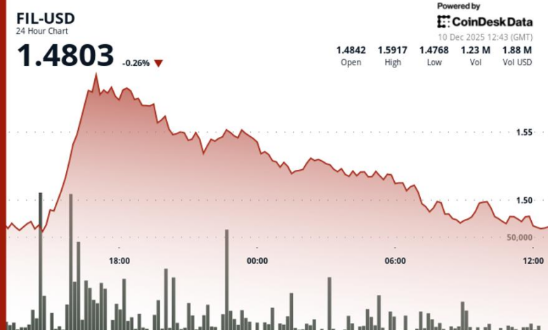 Filecoin slipped 0.3% to $1.48 over the last 24 hours, as the token underperformed wider crypto markets.