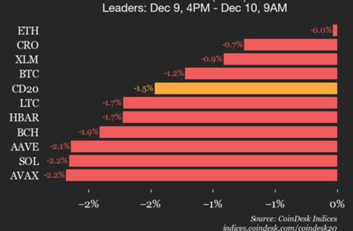 CoinDesk Indices presents its daily market update, highlighting the performance of leaders and laggards in the CoinDesk 20 Index.